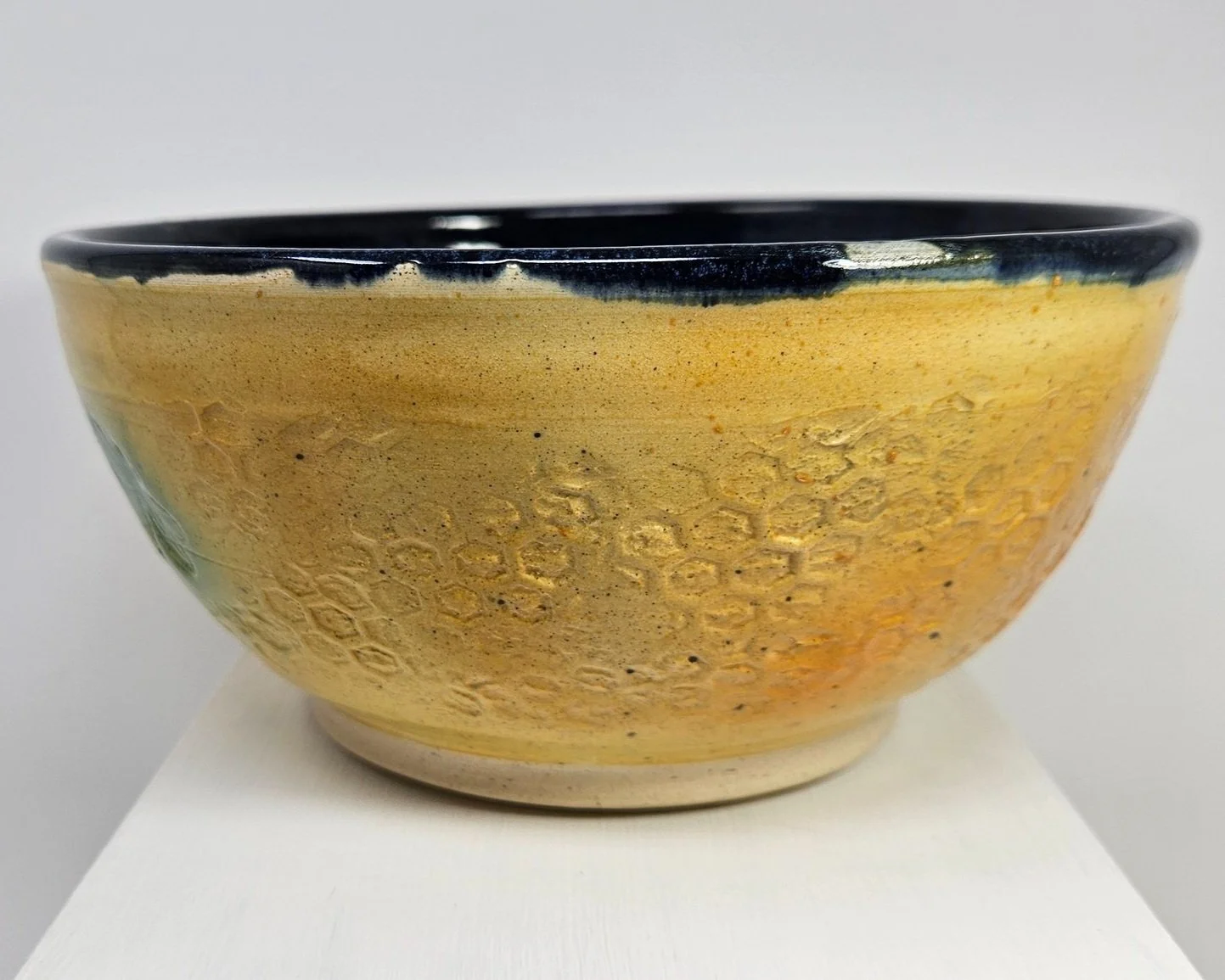 Thrown mixing bowl featuring stamped dragonflies among a honey comb design with a dark blue mottled interior.